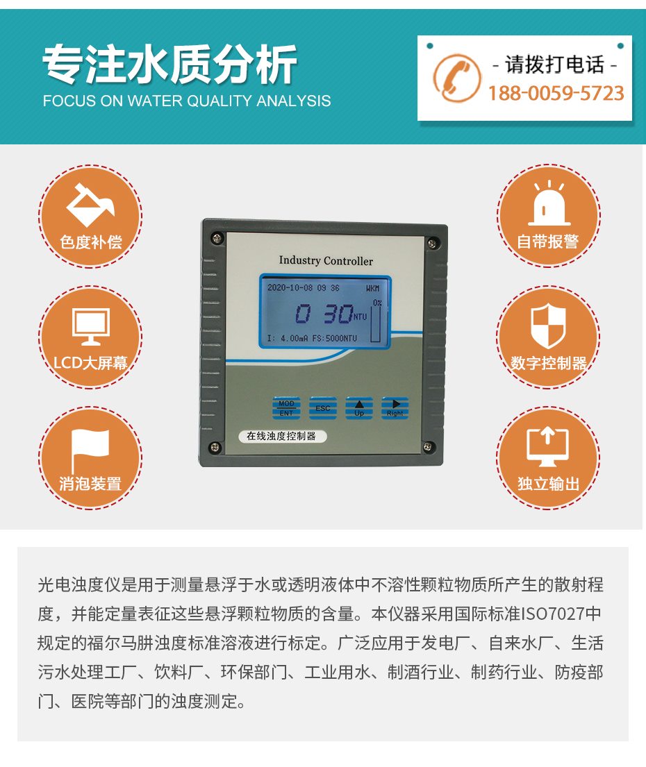 光電濁度儀是用于測量懸浮于水或透明液體中不溶性顆粒物質所產生的散射程度,并能定量表征這些懸浮顆粒物質的含量。本儀器采用國際標準ISO7027中規定的福爾馬肼濁度標準溶液進行標定。廣泛應用于發電廠、自來水廠、生活污水處理工廠、飲料廠、環保部門、工業用水、制酒行業、制藥行業、防疫部門、醫院等部門的濁度測定。